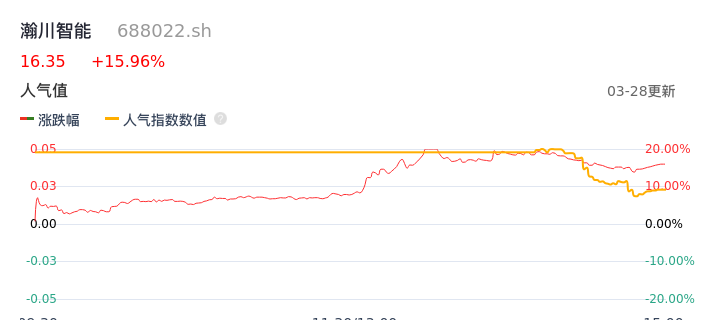 03月28日,瀚川智能收报16.35,股价涨幅15.96%,成交金额2.09亿元,换手率7.42%。
