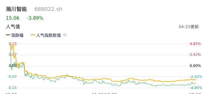 04月25日,瀚川智能收报15.06,股价涨幅-3.89%,成交金额2.10亿元,换手率7.72%。