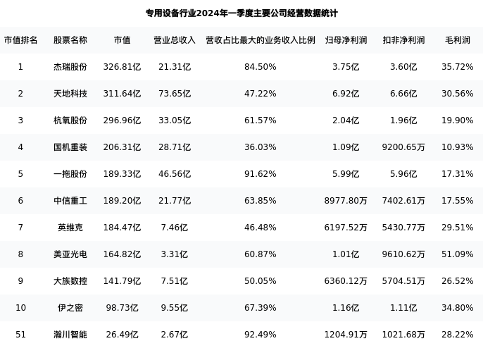 瀚川智能最新报告期数据为一季度,下表汇总了专用设备行业内市值靠前的公司一季度主要经营数据