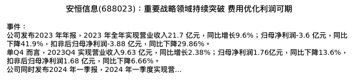 值得注意的是:2024年04月浙商证券的刘雯蜀/刘静一/张致远分析师,首次发布关于安恒信息的研究报告,标题为:安恒信息(688023):重要战略领域持续突破 费用优化利润可期。