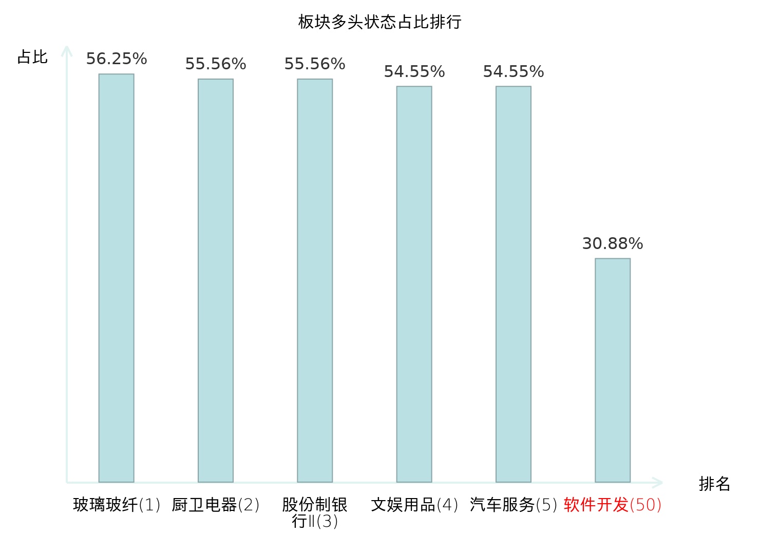 全市场所有行业板块中主力多头状态占比排名中,玻璃玻纤板块位居第一。航天装备Ⅱ板块名次提升最快,较昨日上升84位。