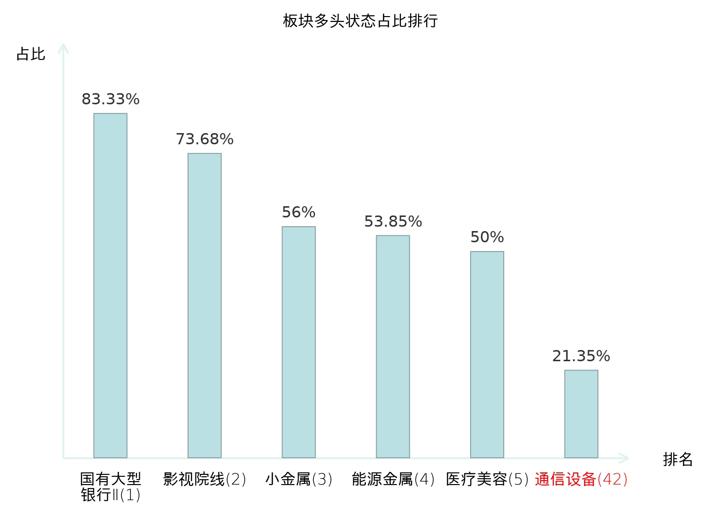 全市场所有行业板块中主力多头状态占比排名中,国有大型银行Ⅱ板块位居第一。电视广播Ⅱ板块名次提升最快,较昨日上升99位。