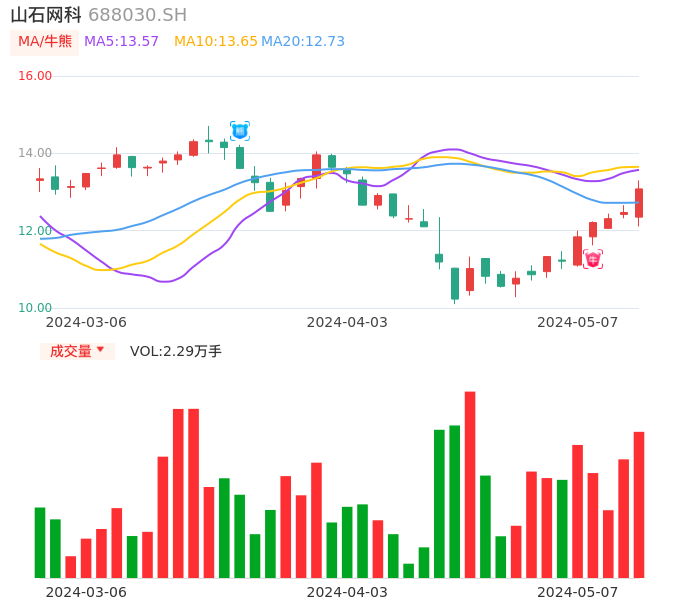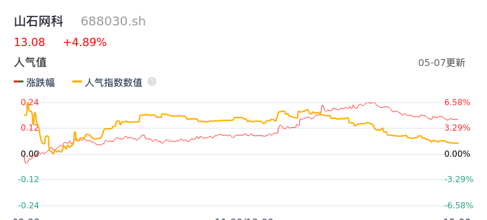 05月07日,山石网科收报13.08,股价涨幅4.89%,成交金额2950.09万元,换手率1.27%。