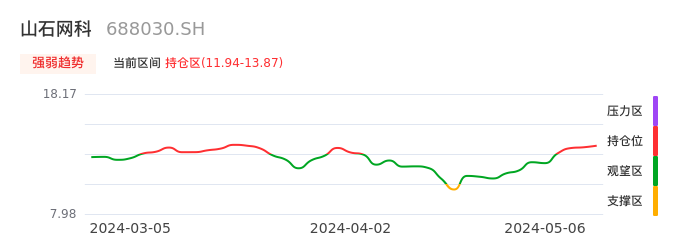 我们来看一下该股的九方特色指标强弱趋势的情况:山石网科自04月26日从观望区上穿到持仓区。股价近期在多头区域持续强势上扬,上升动能仍较为充足,可积极关注。后续重点关注上方压力位:13.87元是否能突破上攻。