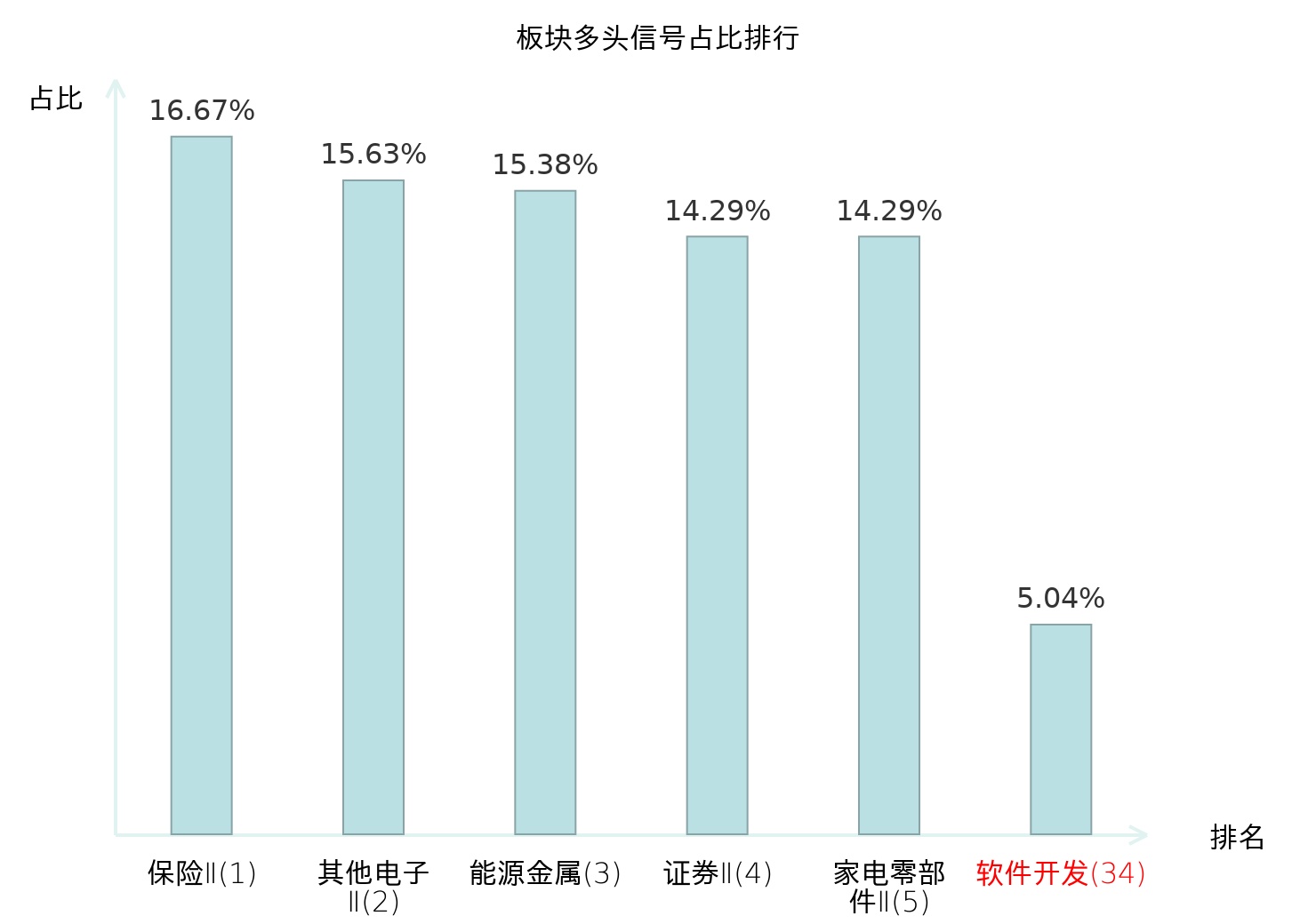 全市场所有行业板块中主力多头信号占比排名中,保险Ⅱ板块位居第一。城商行Ⅱ板块名次提升最快,较昨日上升97位。