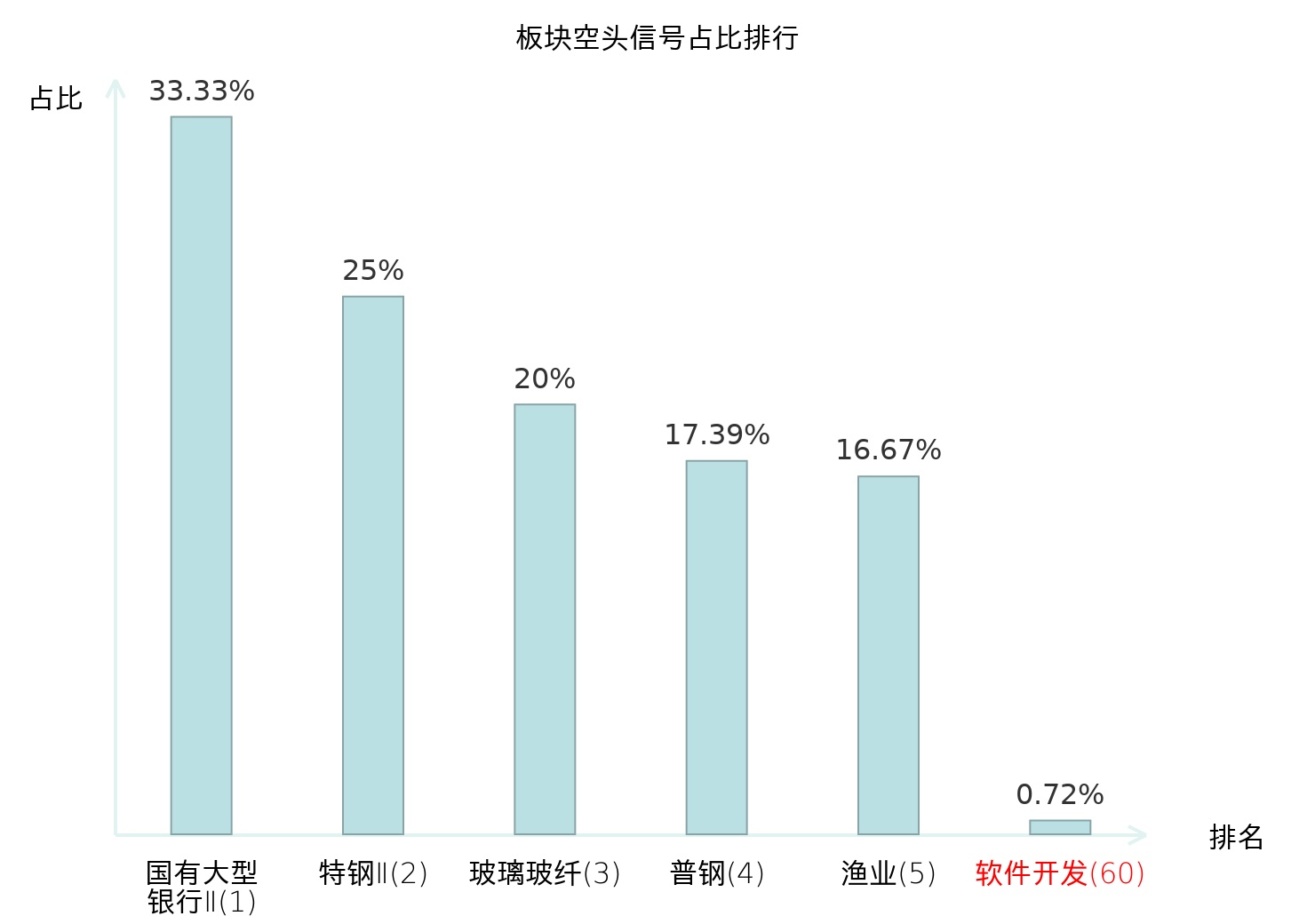 全市场所有行业板块中主力空头信号占比排名中,国有大型银行Ⅱ板块位居第一。普钢板块名次提升最快,较昨日上升115位。