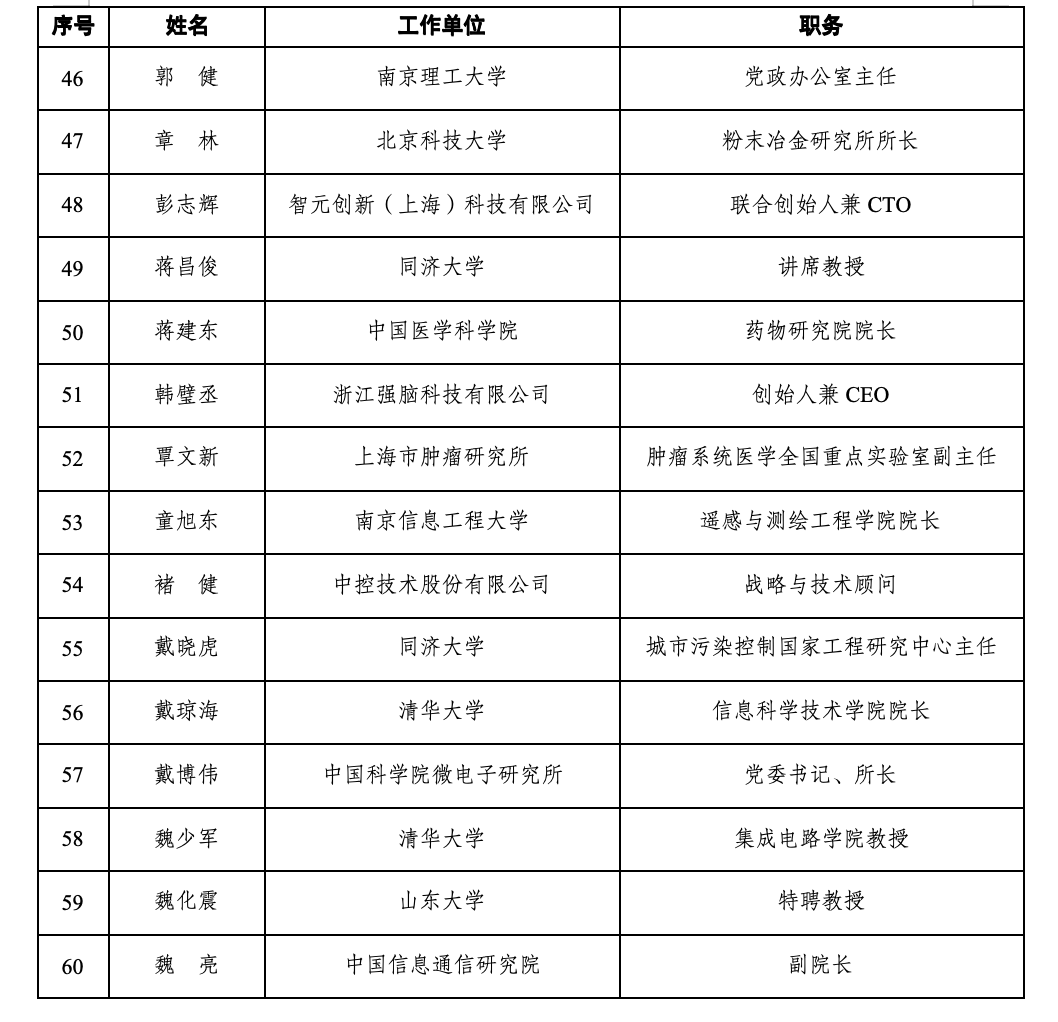 根据公示名单,新一届科技创新咨询委员会委员候选人共有60人,有来自国家部委机关、高校、研究院的人士,也有来自上市公司、非上市科技公司方面的高管,还有来自投资机构的高管。