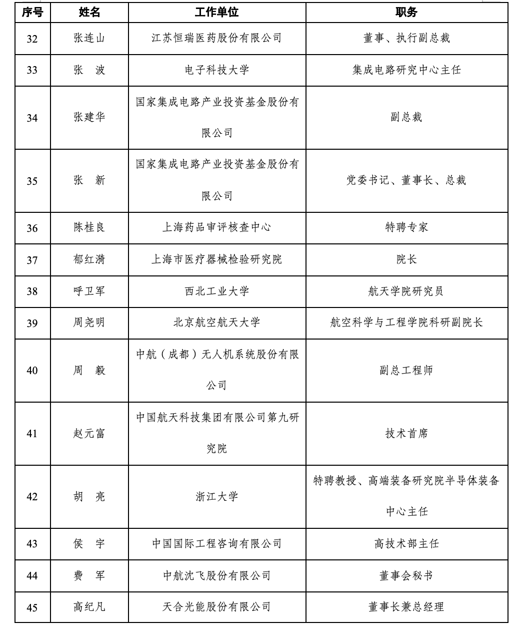 中微公司(688012.SH)董事长兼总经理尹志尧,恒瑞医药(600276.SH)董事、执行副总裁张连山,北京百度网讯科技有限公司首席技术官王海峰等,在第一届和第二届均为委员,若第三届仍被聘任,将蝉联三届委员。