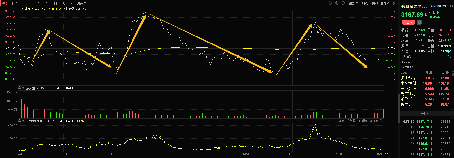 今天盘中CPO方向反反复复,多次冲高回落,尾盘中际旭创在订单的小作文的刺激下,又大涨了10%+,带动CPO回暖,但是大部分个股都是冲高回落,或者弱反弹的,板块的涨跌基本就看易中天三只票的脸色,连续2天跌破5日线了,所以我还是保持昨天咱们复盘的观点,有底仓的,你要做好节奏去高抛低吸,没有底仓的先行规避是比较好的,这个方向今年积累了很多的抱团资金,昨天大阴线基本已经是预告短期一个调整的格局,期间的反复追涨容易亏钱。