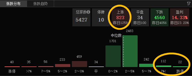 红盘家数仅800+,超4500股绿盘待涨,涨停40家,跌停22家,连续2天的跌停家数超过20,而今天跌幅超7%以上依旧有超110家,全天缩量近5200亿,全市场只有2.4万亿不到,大幅的缩量,需求减弱,而下午继续往下杀+缩量的局部抱团,导致亏钱效应比较明显了。