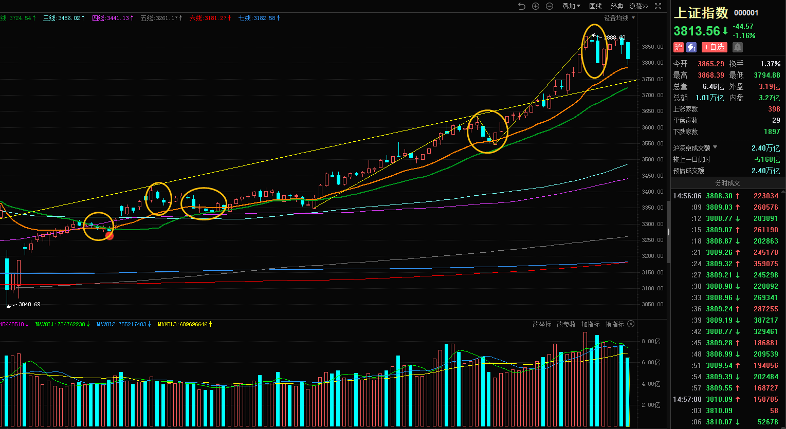 毕竟牛市也不是一路狂奔,而是也会有一波三折的向上攀登,因此这里回踩3800附近不悲观,我们认为这是轻仓或者空仓者的机会!
