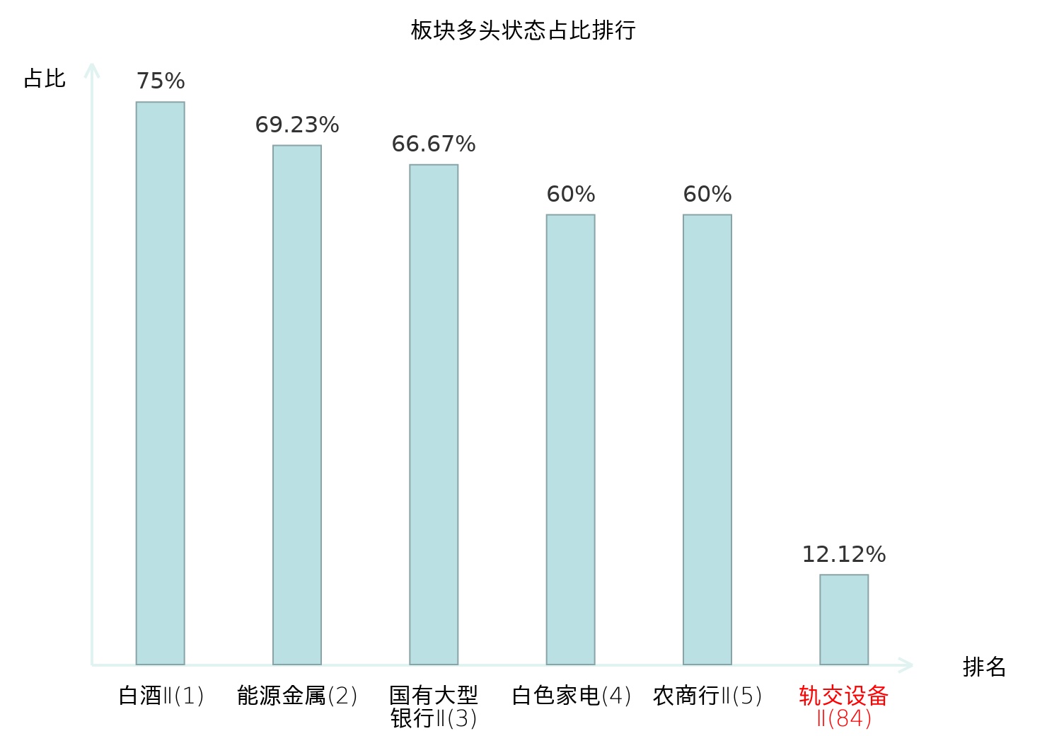 全市场所有行业板块中主力多头状态占比排名中,白酒Ⅱ板块位居第一。房地产服务板块名次提升最快,较昨日上升86位。