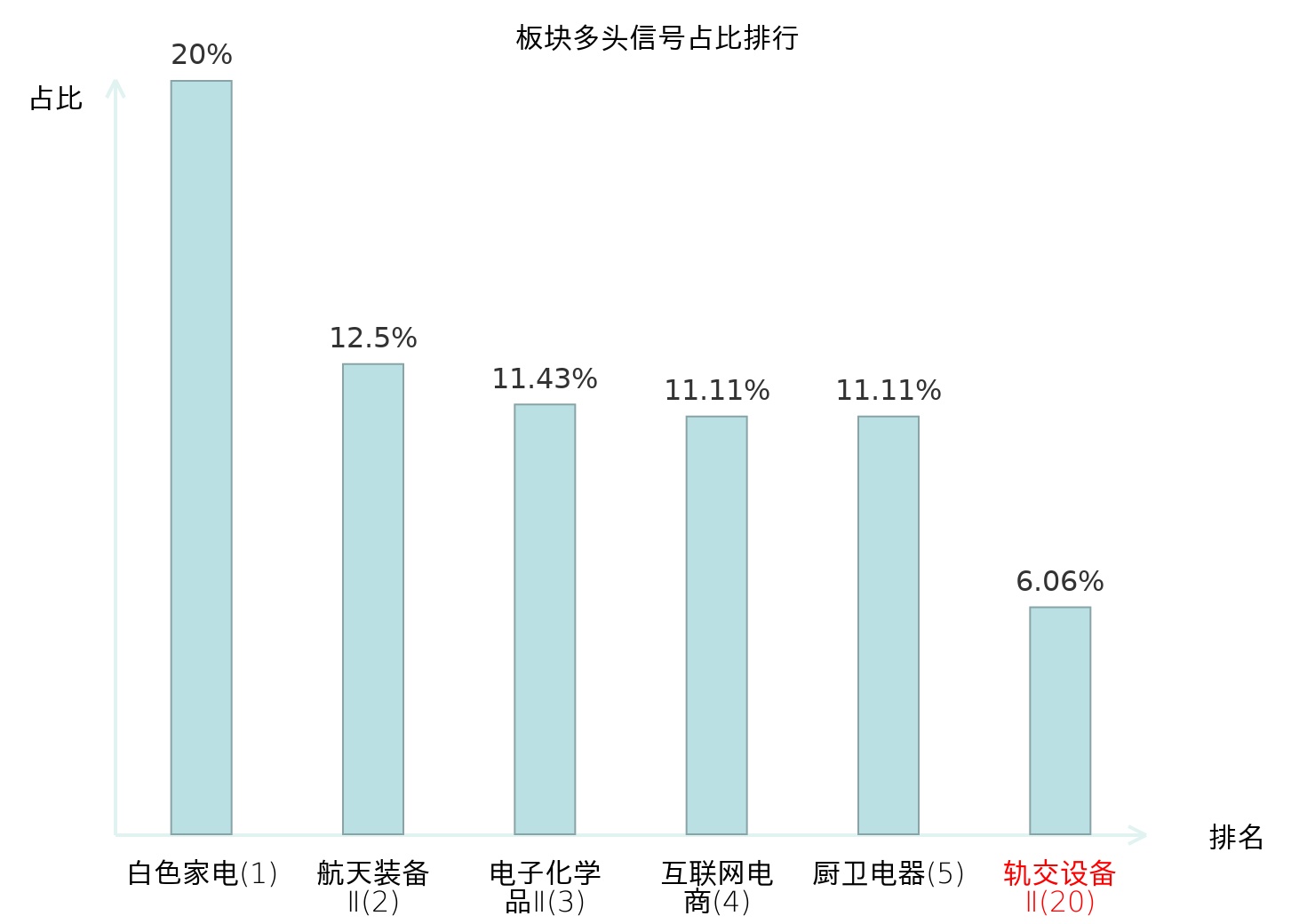 全市场所有行业板块中主力多头信号占比排名中,白色家电板块位居第一。航天装备Ⅱ板块名次提升最快,较昨日上升118位。