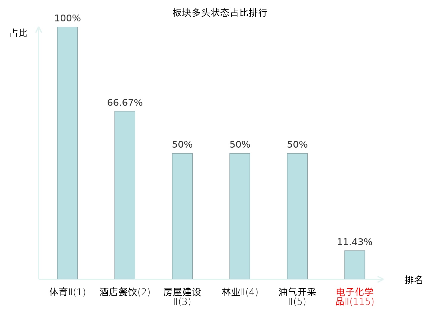 全市场所有行业板块中主力多头状态占比排名中,体育Ⅱ板块位居第一。国有大型银行Ⅱ板块名次提升最快,较昨日上升100位。