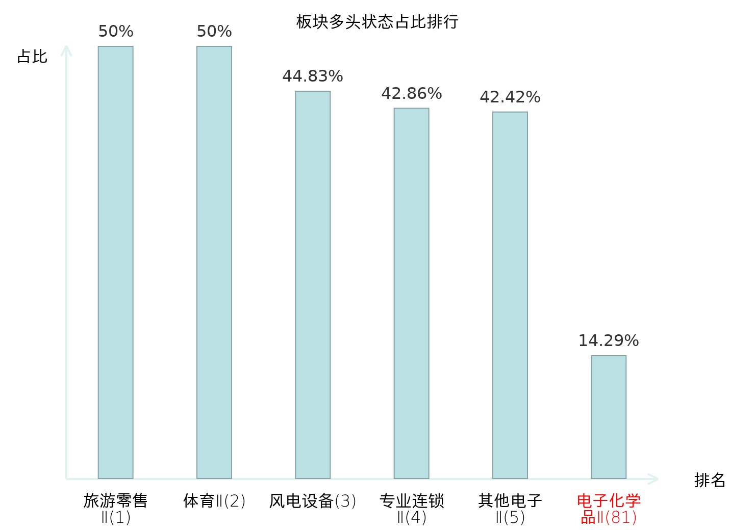全市场所有行业板块中主力多头状态占比排名中,旅游零售Ⅱ板块位居第一。化妆品板块名次提升最快,较昨日上升66位。