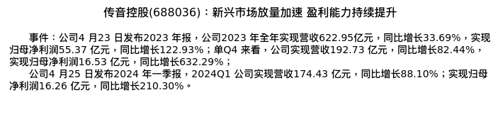 值得注意的是:2024年05月太平洋的张世杰/罗平分析师,首次发布关于传音控股的研究报告,标题为:传音控股(688036):新兴市场放量加速 盈利能力持续提升。