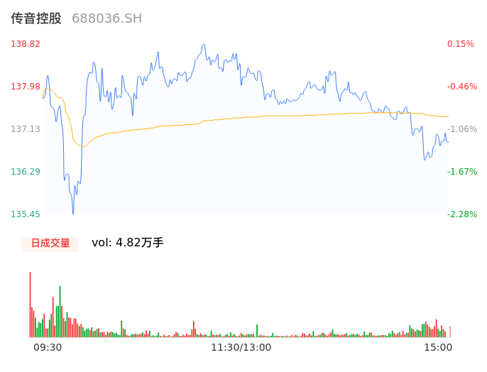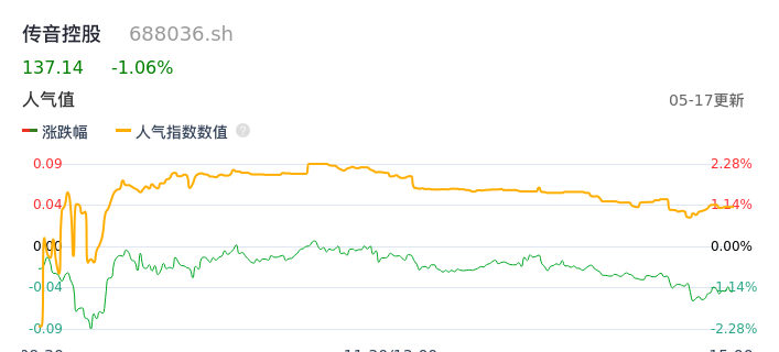 05月17日,传音控股收报137.14,股价涨幅-1.06%,成交金额6.62亿元,换手率0.60%。