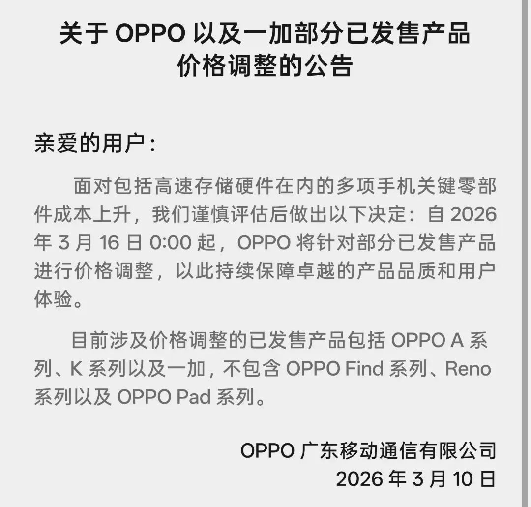 3月10日,OPPO官宣,面对包括高速存储硬件在内的多项手机关键零部件成本上升,OPPO决定自2026年3月16日0:00起,针对部分已发售产品进行价格调整,以此持续保障卓越的产品品质和用户体验。目前涉及价格调整的已发售产品包括OPPO A系列、K系列以及一加,不包含OPPO Find系列、Reno系列以及OPPO Pad系列。不过,此次OPPO暂未发布具体调价幅度。此次OPPO暂未发布具体调价幅度。知情人士向证券时报·e公司记者透露,过几天会公布涨价细节。