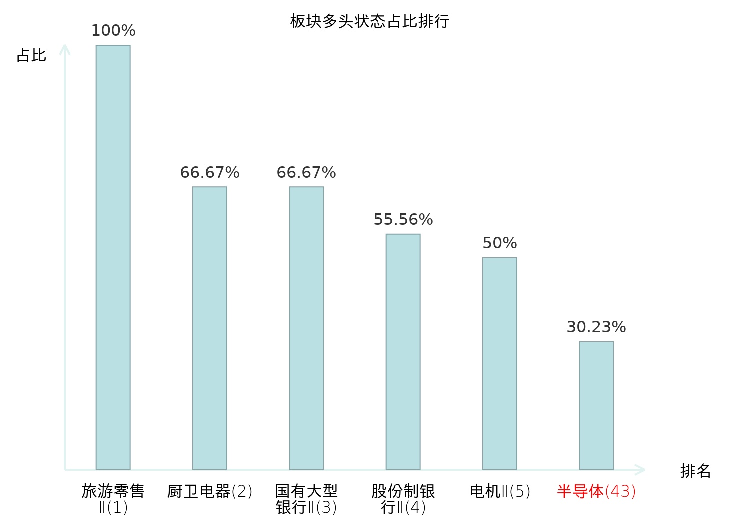 全市场所有行业板块中主力多头状态占比排名中,旅游零售Ⅱ板块位居第一。水泥板块名次提升最快,较昨日上升80位。