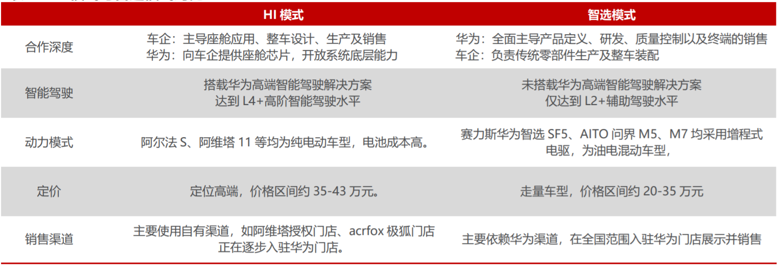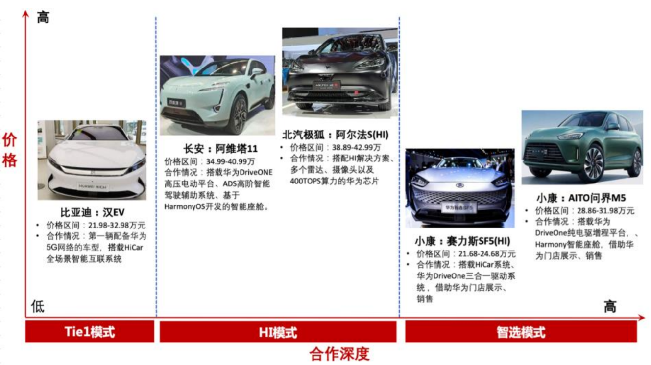其中,零部件供应模式,也是最初的B端业务;其二是HI(Huawei Inside)解决方案集成模式;其三是华为智选模式,从汽车设计到销售渠道全覆盖,和赛力斯合作的问界是典型的代表。