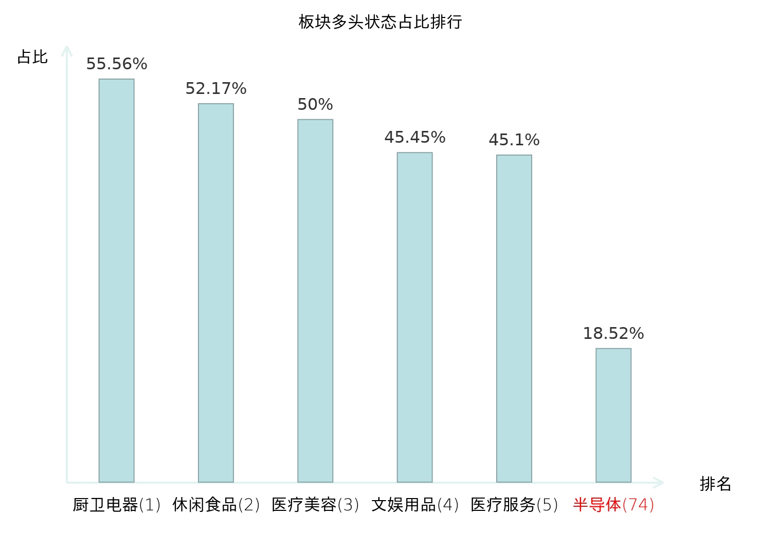 全市场所有行业板块中主力多头状态占比排名中,厨卫电器板块位居第一。林业Ⅱ板块名次提升最快,较昨日上升87位。