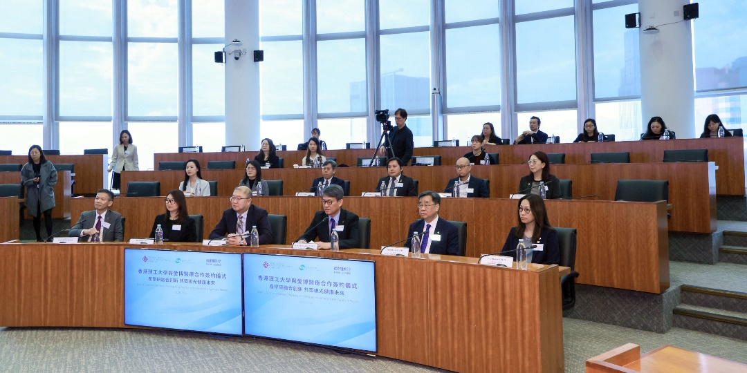 签约仪式于理大校园举行,爱博医疗创始人、董事长兼总经理解江冰博士和理大高级副校长(研究及创新)赵汝恒教授代表双方签署合作协议。