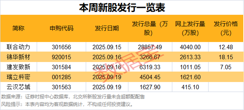 根据发行安排,本周暂有5只新股申购,周一(9月15日)可申购联合动力,周二可申购建发致新、锦华新材,周五可申购瑞立科密、云汉芯城。