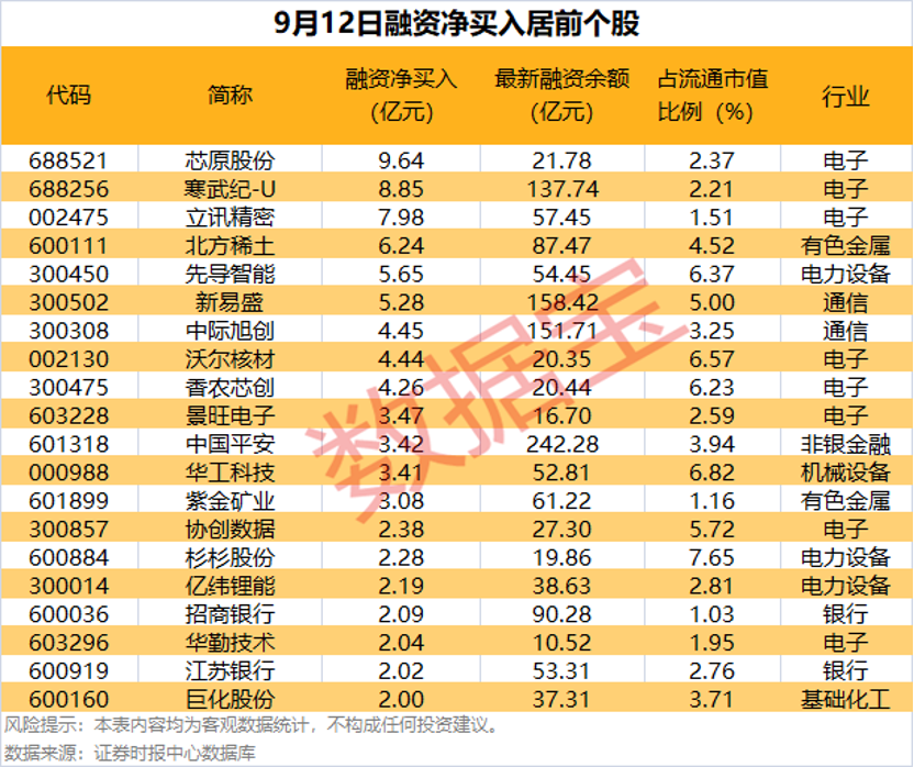 具体到个股,9月12日获融资净买入1亿元以上的有53股,其中6股融资净买入额均超5亿元。