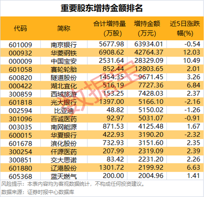 其次是华菱钢铁,重要股东增持量为6908.62万股,增持金额4.28亿元;中国宝安近5日获股东增持2.83亿元,增持金额位居第三。