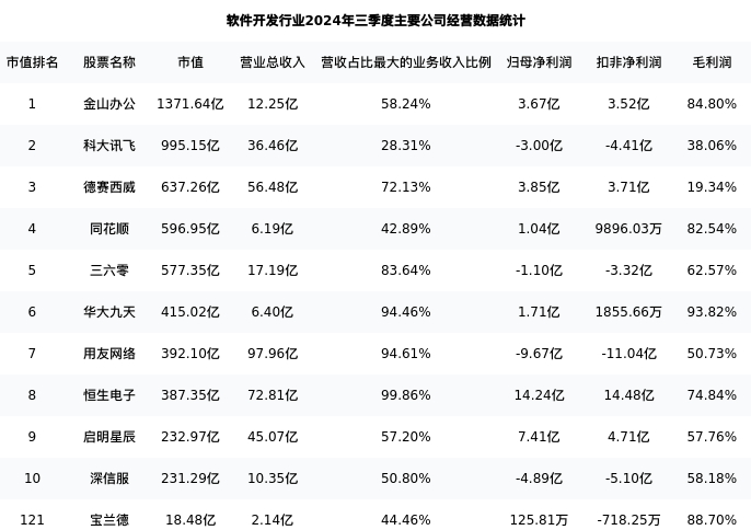 宝兰德最新报告期数据为三季度,下表汇总了软件开发行业内市值靠前的公司三季度主要经营数据