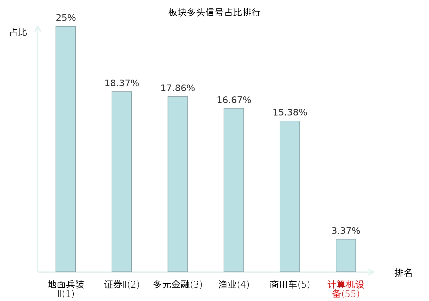 全市场所有行业板块中主力多头信号占比排名中,地面兵装Ⅱ板块位居第一。渔业板块名次提升最快,较昨日上升119位。