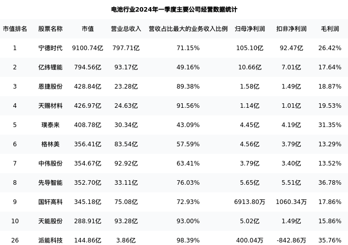 派能科技最新报告期数据为一季度,下表汇总了电池行业内市值靠前的公司一季度主要经营数据