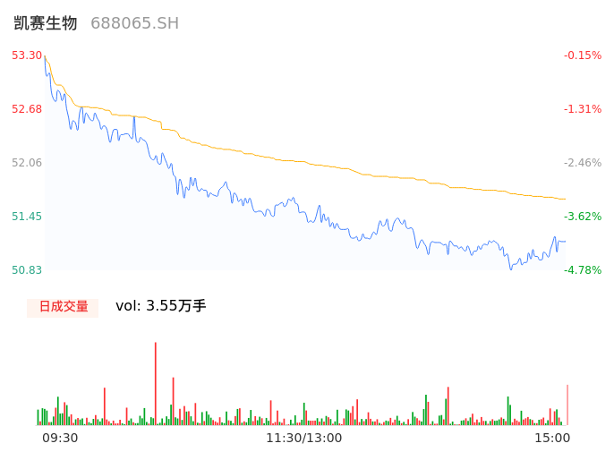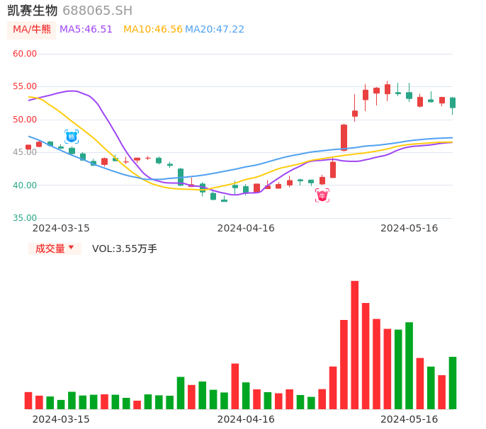05月16日,凯赛生物收报51.80,股价涨幅-2.96%,成交金额1.84亿元,换手率0.61%。