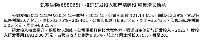 值得注意的是:2024年05月海通证券的朱军军/胡歆/刘威分析师,首次发布关于凯赛生物的研究报告,标题为:凯赛生物(688065):推进研发投入和产能建设 积累增长动能。