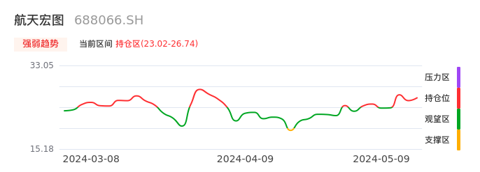 我们来看一下该股的九方特色指标强弱趋势的情况:航天宏图近日从观望区上穿到持仓区。股价短期站稳多头区域,上升动能仍较为充足,可积极关注。后续重点关注上方压力位:26.74元是否能突破上攻。