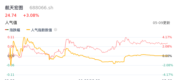 05月09日,航天宏图收报24.74,股价涨幅3.08%,成交金额4.89亿元,换手率7.65%。