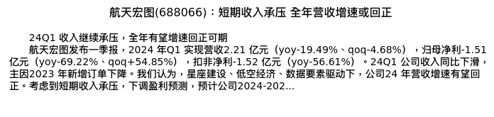 值得注意的是:2024年04月华泰证券的谢春生分析师,首次发布关于航天宏图的研究报告,标题为:航天宏图(688066):短期收入承压 全年营收增速或回正。
