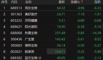 上证报中国证券网讯 8月26日午后,医药生物板块震荡下挫,截至13时19分,苑东生物跌近9%,美好医疗跌超7%,济民健康、阳光诺和、热景生物、广生堂等跌逾5%。