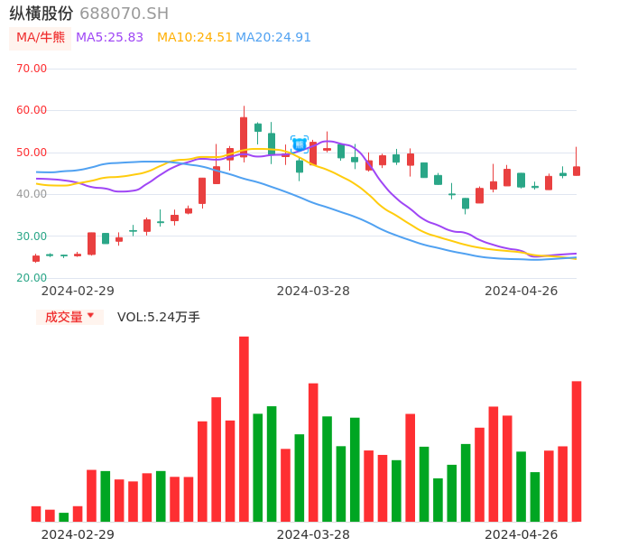 04月26日,纵横股份收报46.54,股价涨幅4.73%,成交金额2.52亿元,换手率5.98%。