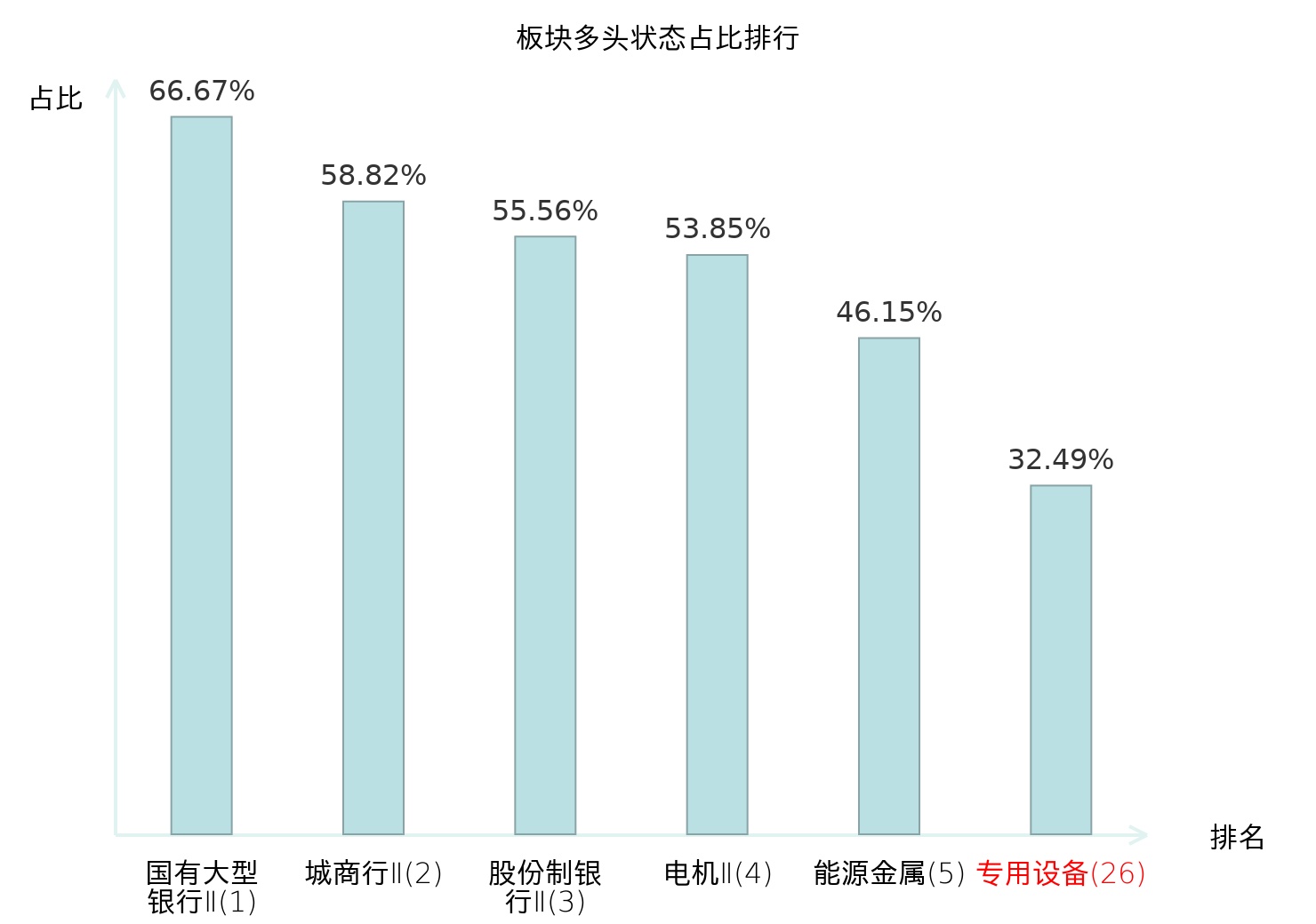 全市场所有行业板块中主力多头状态占比排名中,国有大型银行Ⅱ板块位居第一。自动化设备板块名次提升最快,较昨日上升57位。