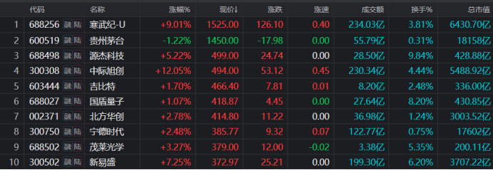 财联社10月24日讯(编辑 梓隆),今日(10月24日),AI龙头寒武纪再掀涨势,截至收盘,其涨幅近9%,股价收于1525元,再次超越贵州茅台(1450元)成为当前股价最高标的。同时,寒武纪全天成交额达234.03亿元,拿下A股今日成交额冠军。
