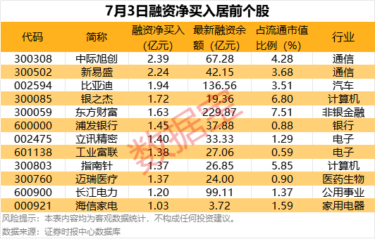 具体到个股,7月3日获融资净买入千万元以上的有341股,其中12股融资净买入额超亿元。中际旭创融资净买入额居首,当日净买入2.39亿元;其次是新易盛、比亚迪,融资净买入金额分别为2.24亿元、1.94亿元;融资净买入金额居前的还有银之杰、东方财富、浦发银行等。