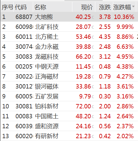 8月27日,稀土永磁概念股再次走高,大地熊上涨超10%,北矿科技涨停,北方稀土金力永磁等多股大涨。