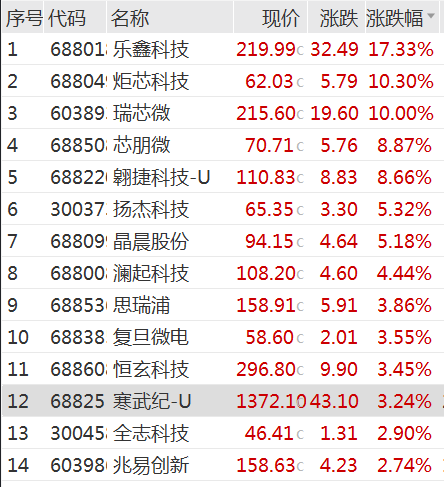 半导体板块中的乐鑫科技盘中实现20%涨停,收盘仍上涨超17%,瑞芯微涨停,扬杰科技晶晨股份澜起科技等跟涨。值得一提的是,寒武纪盘中股价一度拉升超过贵州茅台的股价,成为A股市场新的“股王”。