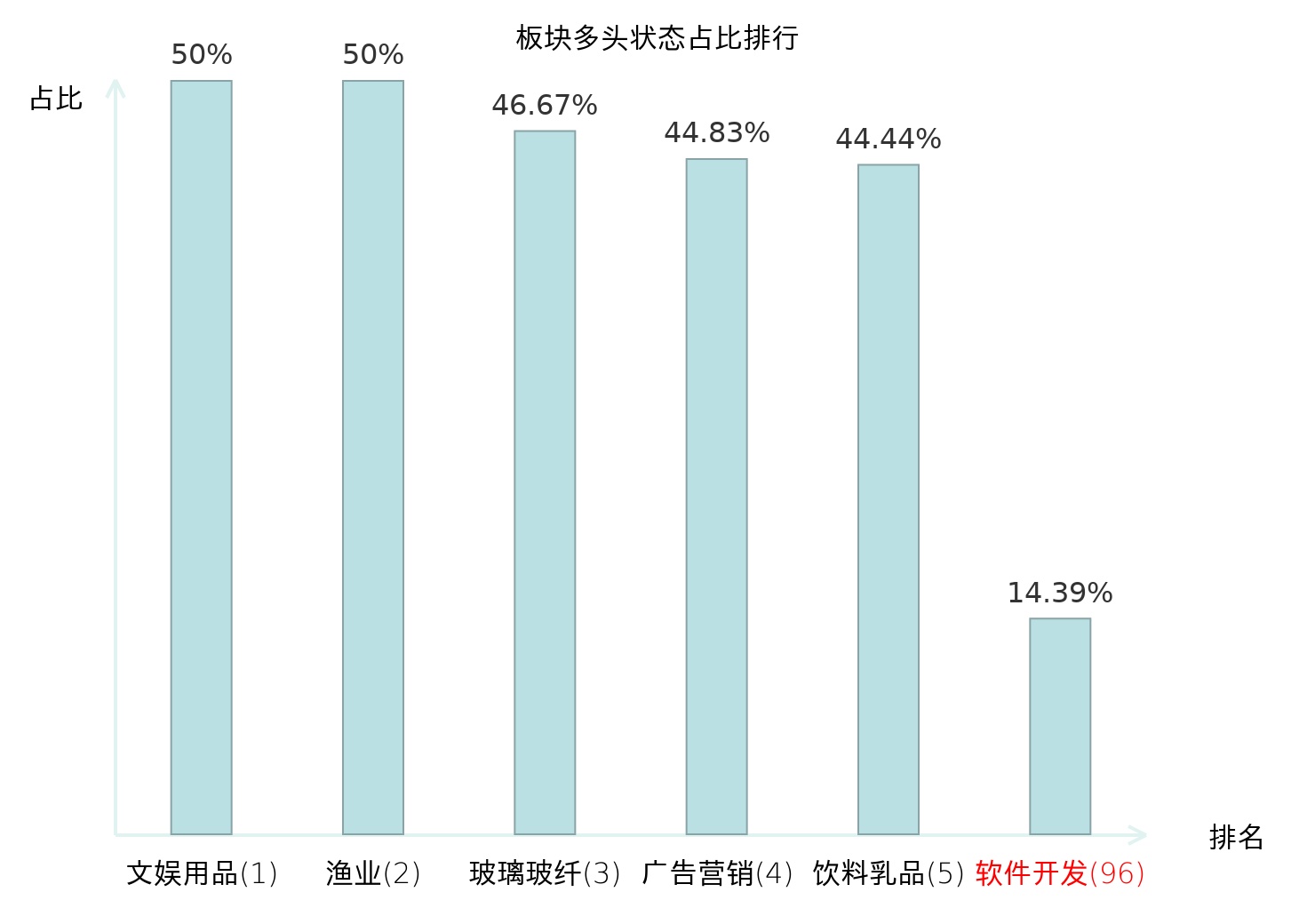 全市场所有行业板块中主力多头状态占比排名中,文娱用品板块位居第一。饮料乳品板块名次提升最快,较昨日上升59位。