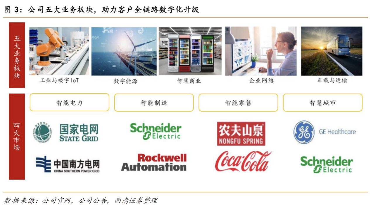 公司业务覆盖企业网络、数字能源、工业与楼宇IoT、智慧商业、车载与运输五大板块。