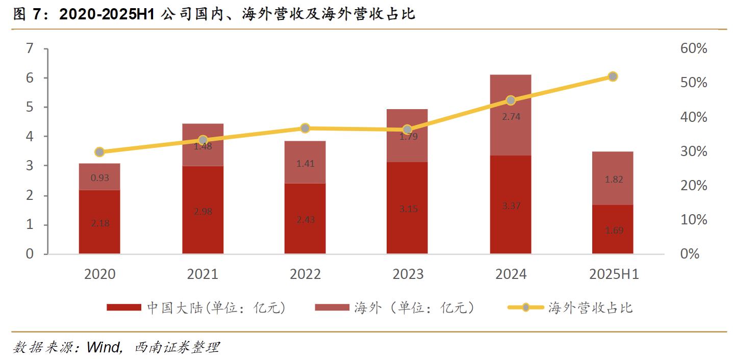 全球化战略成效显著,海外业务加速放量:公司全球化布局成果在近期业绩中集中体现。2025年上半年,海外营收达1.82亿元,同比高速增长55.97%,营收占比首次超过国内,达到51.8%。公司通过设立新加坡子公司深化亚太布局,并扩建加拿大工厂以应对北美市场需求及关税风险,全球化渠道与供应链体系为海外业务的持续性提供保障。