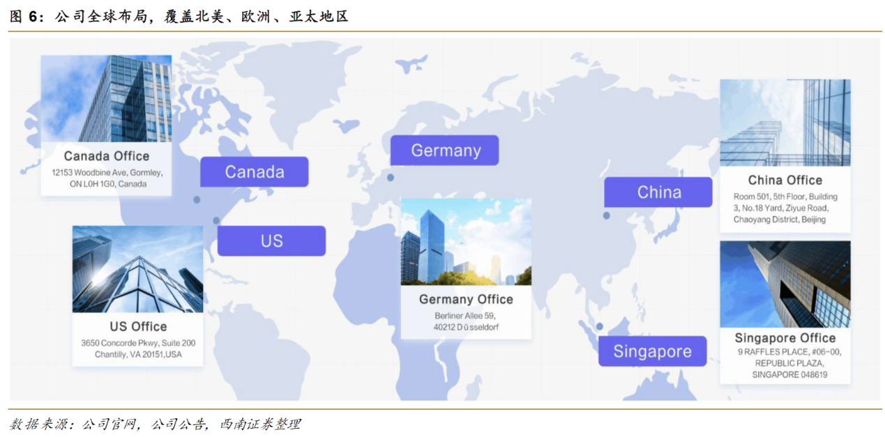 全球化营销集道、产品矩阵双轮驱动。公司积极推进海外布局,重视营销团队打造与渠道建设,因地制宜推出定制化服务,持续深耕全球各区域市场。产品方面不断推陈出新,云平台、Al技术、算法、边缘计算机等产品研发、迭代同步推进,构建多维度产品矩阵,带动放量与营收结构优化。