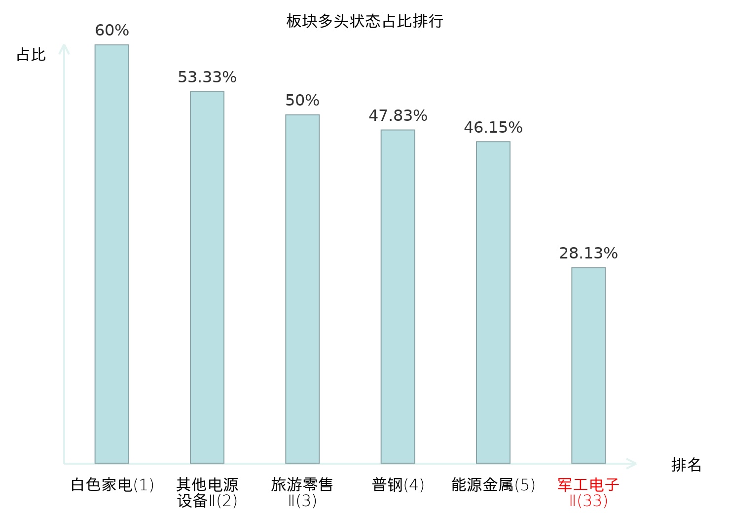 全市场所有行业板块中主力多头状态占比排名中,白色家电板块位居第一。照明设备Ⅱ板块名次提升最快,较昨日上升55位。