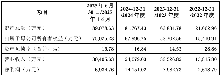 财务方面,于2022年、2023年、2024年及2025年1-6月,公司实现营业收入分别约为1.58亿元、3.25亿元、5.41亿元、3.04亿元人民币;同期净利润分别约为2618.79万元、7982.73万元、1.42亿元、6934.76万元人民币。